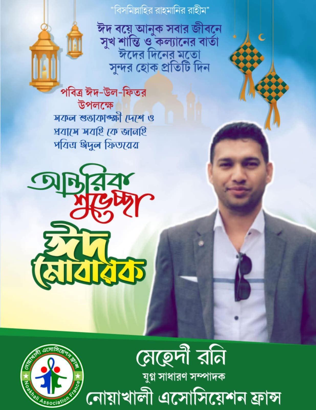পবিত্র ঈদুল ফিতর উপলক্ষে দেশ-বিদেশে অবস্থানরত সকল মুসলিম উম্মাহর প্রতি আন্তরিক শুভেচ্ছা ও ঈদ মোবারক জানিয়েছেন নোয়াখালী এসোসিয়েশন ফ্রান্সের যুগ্ম সাধারণ সম্পাদক মেহেদী রনি। এক