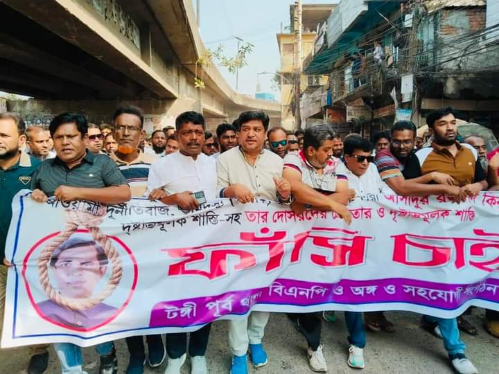 গাজীপুর সিটি করপোরেশনের সাবেক ভারপ্রাপ্ত মেয়র আসাদুর রহমান কিরণের দৃষ্টান্তমূলক শাস্তির দাবিতে বিক্ষোভ মিছিল ও সমাবেশ করেছে টঙ্গী পূর্ব থানা বিএনপির নেতাকর্মীরা। বুধবার টঙ্গীর সাহারা মার্কেট এলাকায় টঙ্গী-কালীগঞ্জ আঞ্চলিক শাখা সড়ক অবরোধ ও ঘণ্টাব্যাপী বিক্ষোভ মিছিল ও সমাবেশ করে বিএনপি ও তার অঙ্গসংগঠনের কয়েকশ নেতাকর্মীরা।