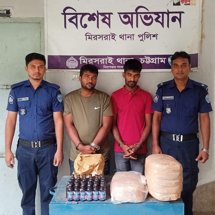 মিরেরসরাই প্রতিনিধি : আজ ১২ জুন মিরসরাই থানা গেইটের দক্ষিন পাশে ঢাকা-চট্টগ্রাম মহাসড়কে  সকালে চট্টগ্রামগামী যাত্রীবাহী গ্রীনলাইন এসি বাসে (ঢাকা মেট্রো-ব-১৫-৪৪০১) তল্লাশী করে ৭ কেজি গাঁজা, যার মূল্য আনুমানিক ৭০ হাজার টাকা ও ৩০ বোতল ফেন্সিডিল, যার মূল্য আনুমানিক ৩০ হাজার টাকাসহ আসামী পারভেজ উদ্দিন (৩০) ও সাহাব উদ্দিন প্রকাশ সাদ্দাম (২৯) কে গ্রেফতার করেছে মিরসরাই থানা পুলিশ।